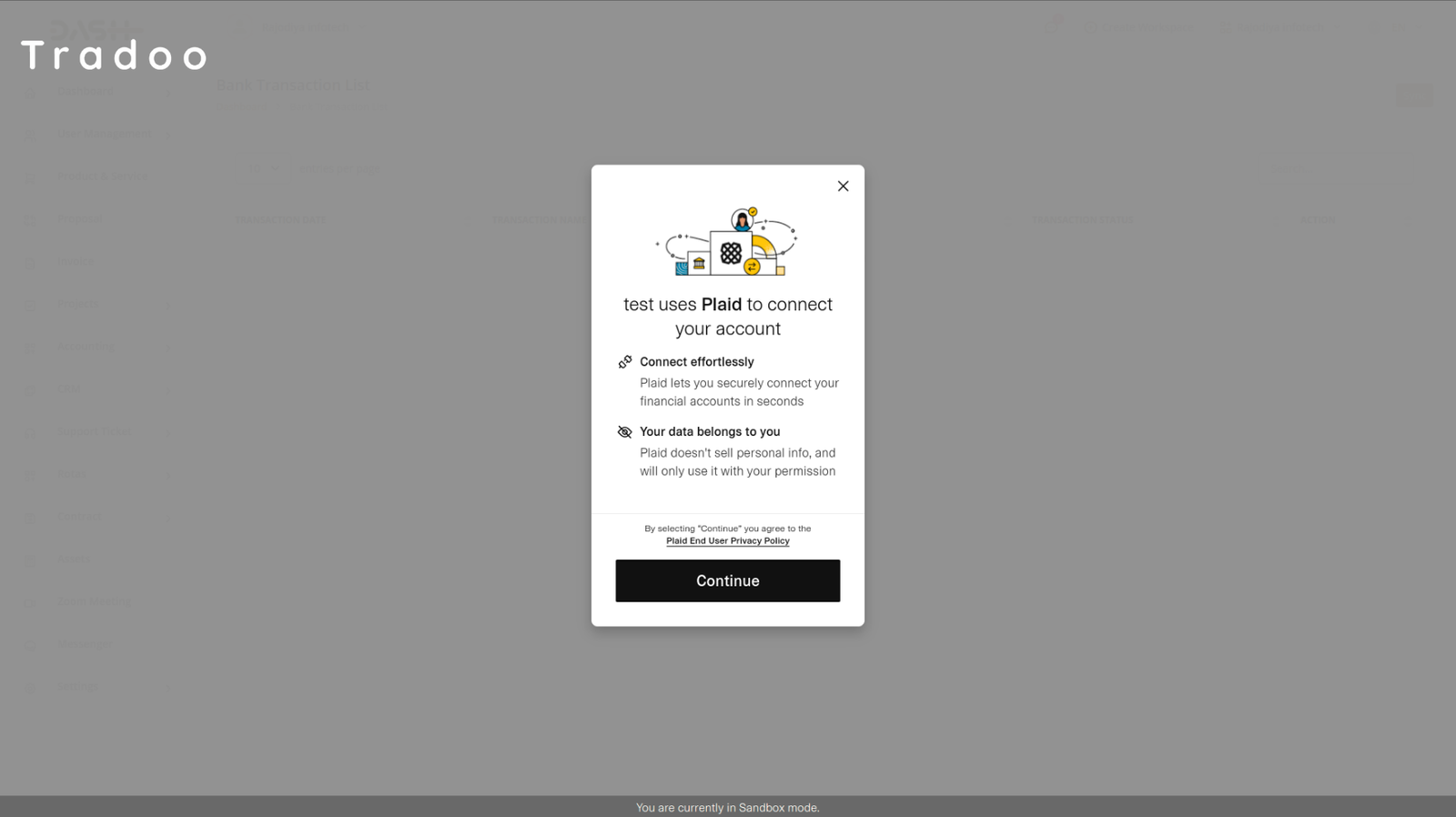 Enable users to securely link their bank and credit card accounts with Tradoo ERP via Plaid. Enjoy seamless access to real-time financial data without compromising on privacy. Designed for transparency, safety, and control — giving users confidence and convenience when managing their finances.