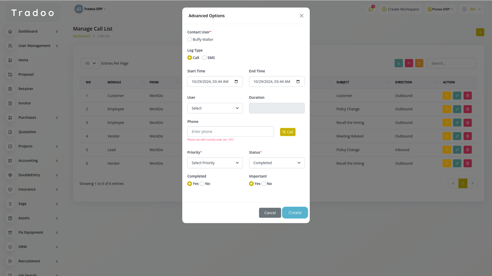 The Call Hub module offers flexibility in communication by allowing users to choose between calls or SMS. It automatically calculates call duration from start to end, assigns specific users for handling calls and messages, and enables custom message creation for employees, clients, or customers. Additionally, it features one-click call and message functionality for instant communication.