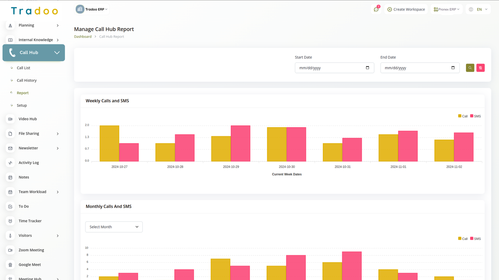 Call Hub provides robust reporting capabilities, allowing users to track the number of calls and SMS sent within a given month and analyze communication patterns over a specific week for better insights and decision-making.