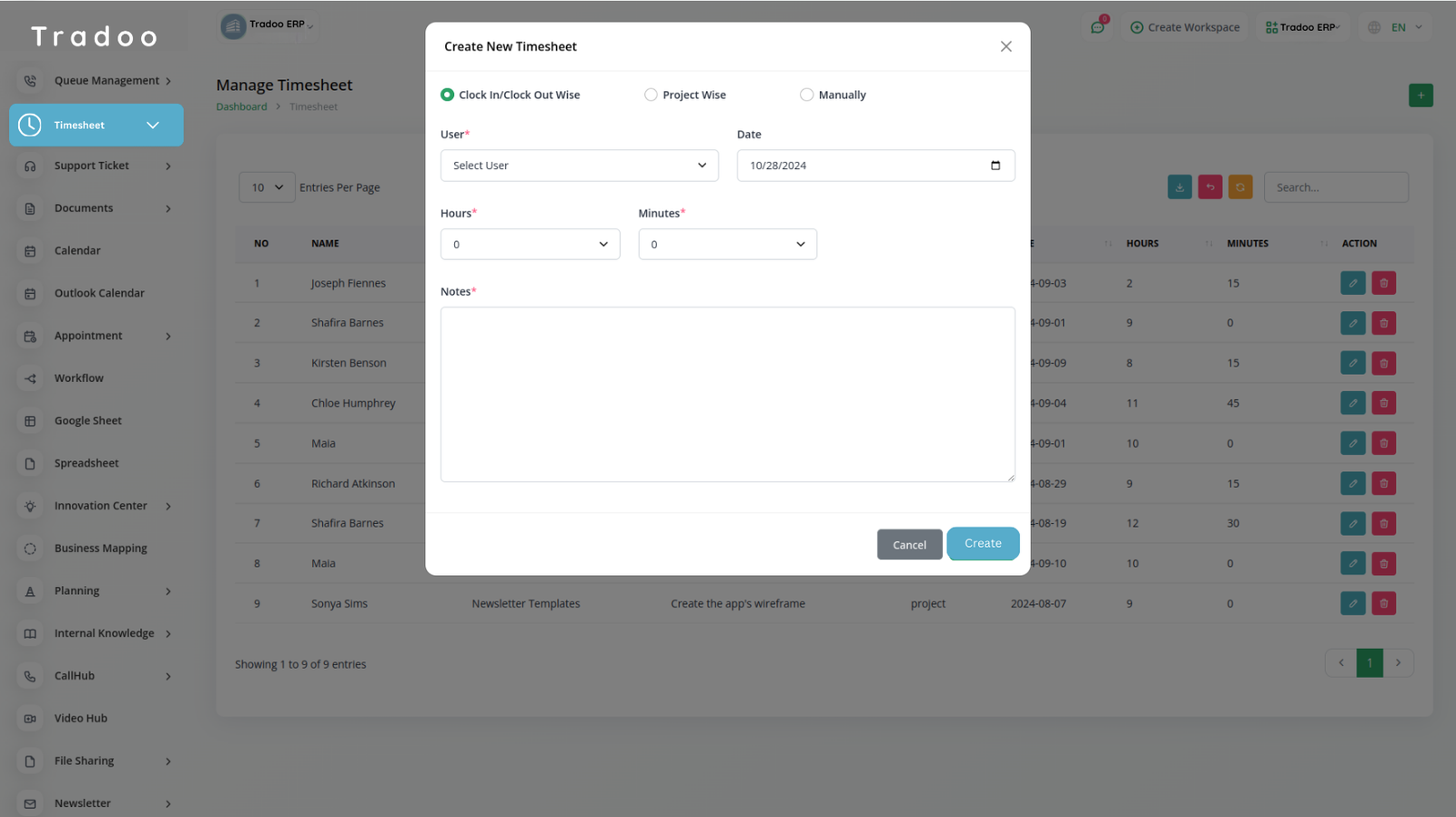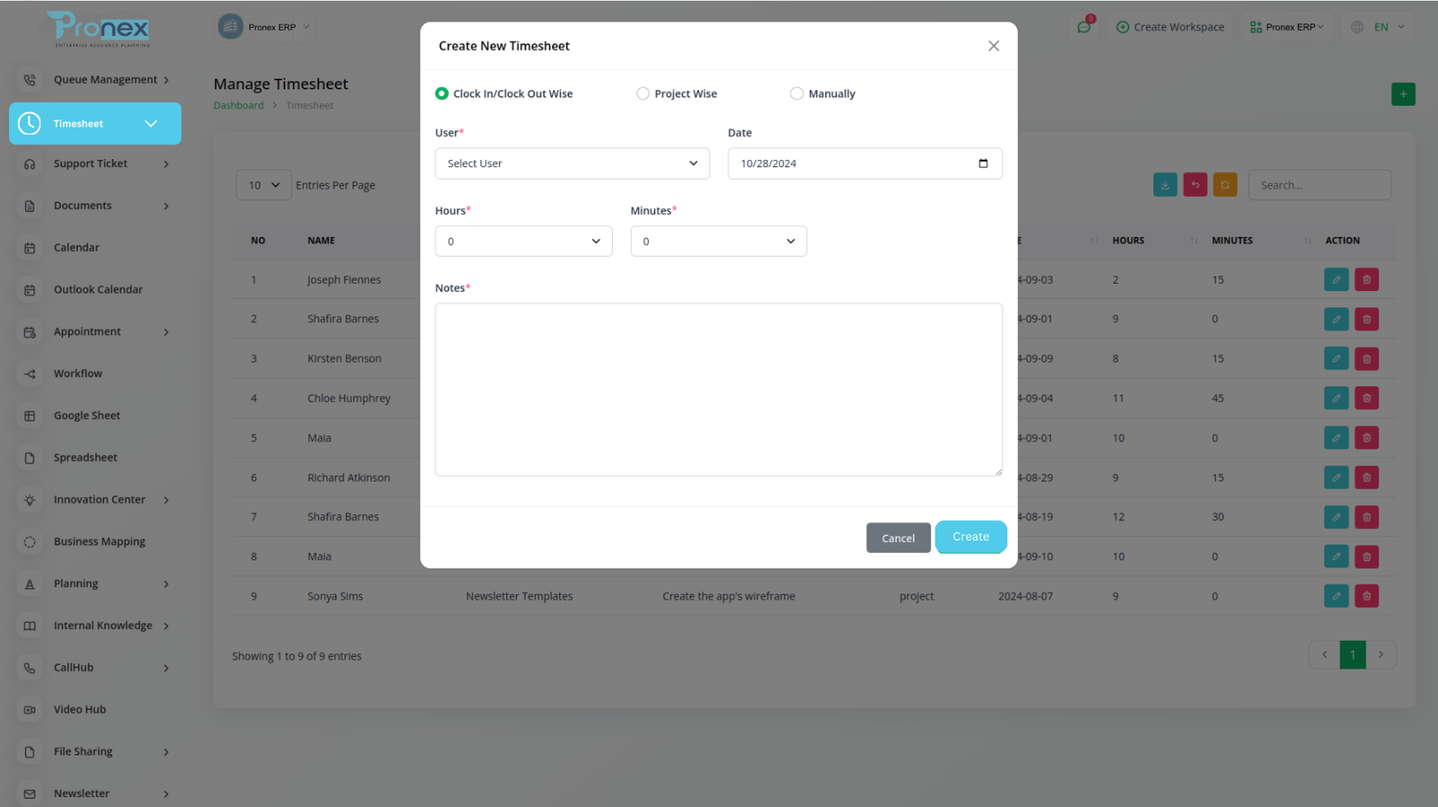 Create a timesheet by assigning specific projects, tasks, and users. Set a starting and ending date, along with the allocated time for each task. This helps you efficiently manage your project and track progress accurately.