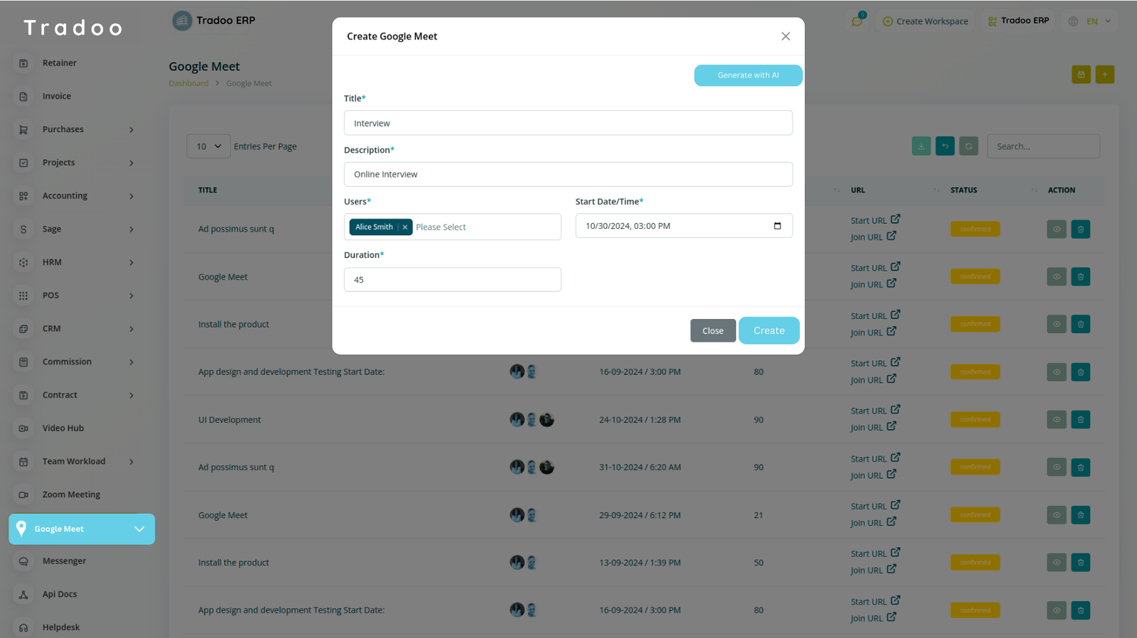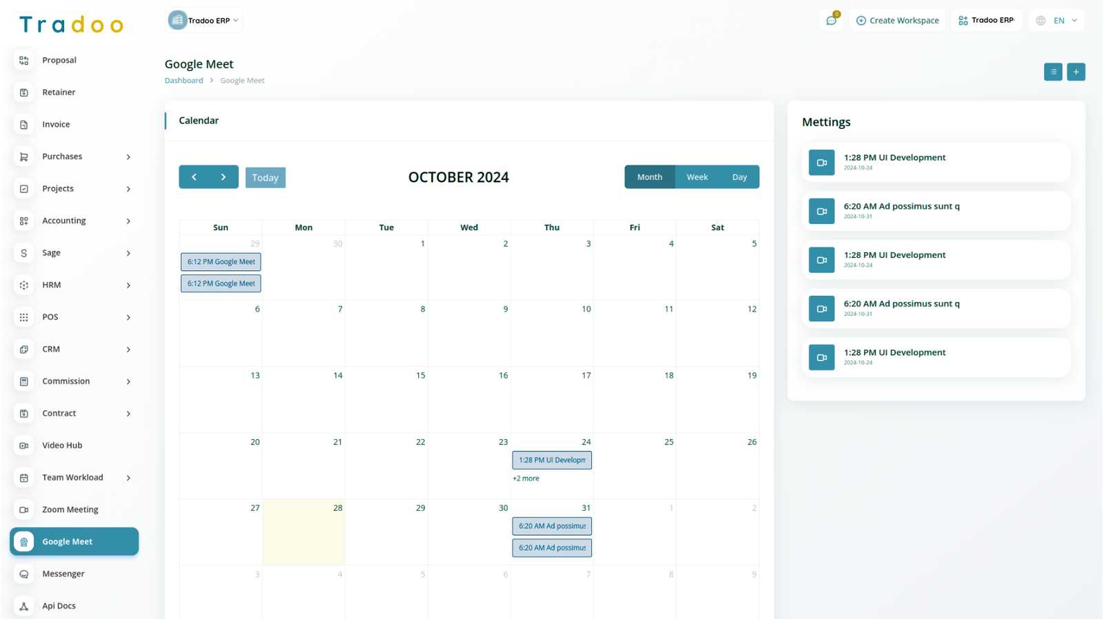 View, track, and manage all upcoming Google Meet sessions from your Tradoo ERP dashboard. Stay organized and in control of your team's schedule.