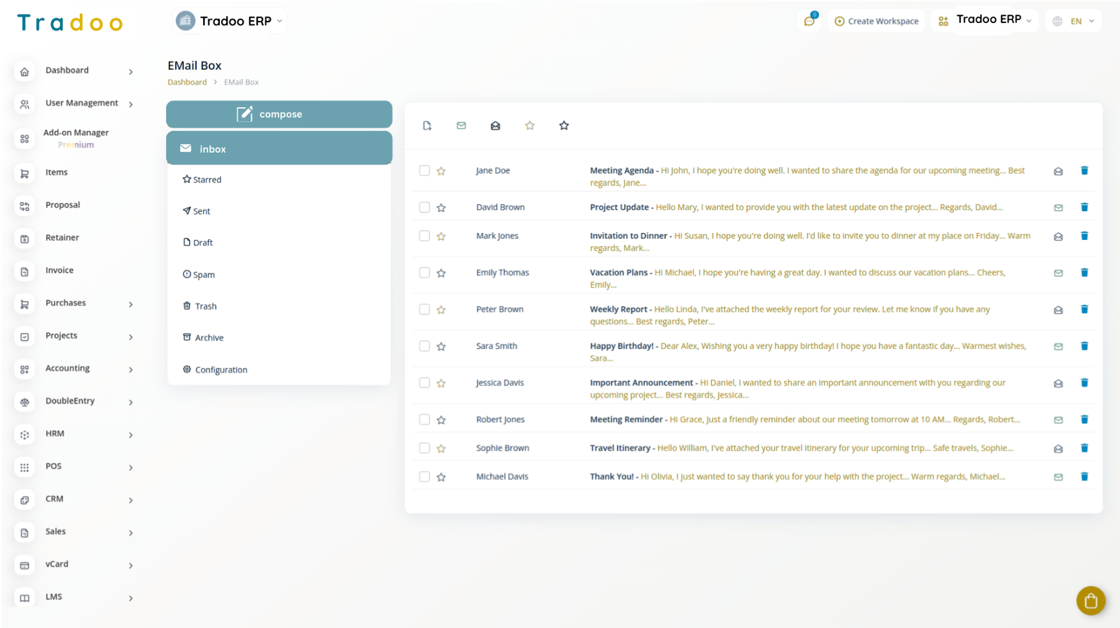 The Email Box module is a robust tool for simplifying email management. It integrates seamlessly with your SMTP server, allowing full control over folders like Inbox, Drafts, Spam, Sent, Trash, and Archive. Additionally, it enhances email interactions, making management more efficient and intuitive.