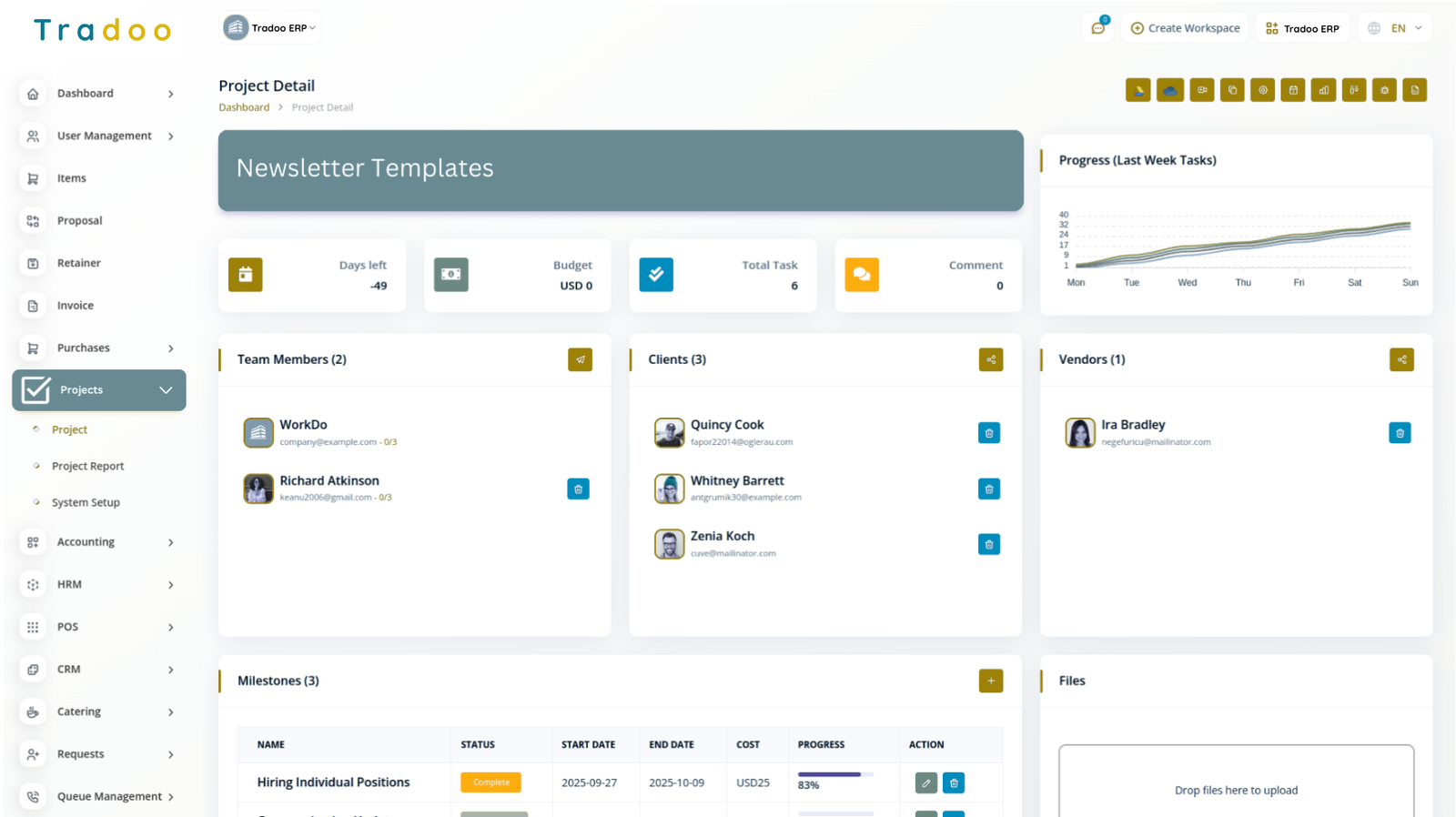 Easily organize client information, collaborate on projects, and provide real-time updates. From sharing files to managing tasks and streamlining payments, Tradoo ERP gives you the tools to deliver a seamless client experience—all in one place.