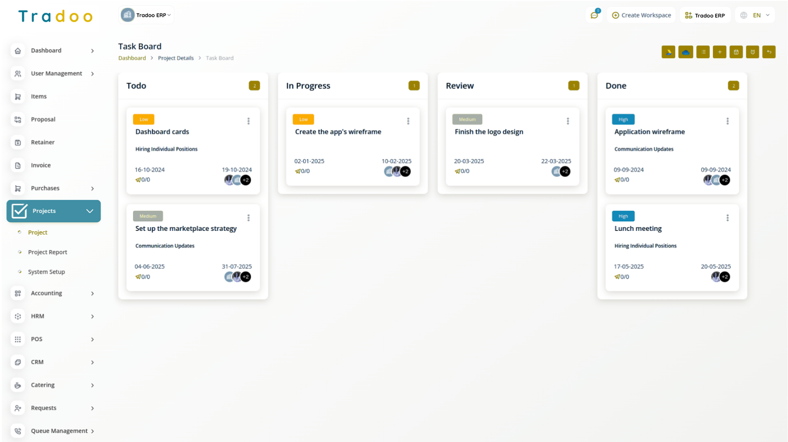 Effortless yet powerful—Tradoo ERP’s Project Manager module lets you plan, execute, and monitor projects from a centralized workspace. Create multiple projects, assign team members, collaborate with clients, and manage workflows with customizable roles and access controls. Enhance transparency, accountability, and productivity—all in one place.