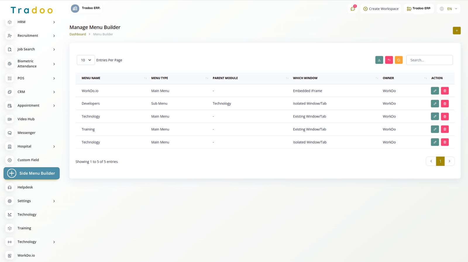 Easily create and manage side menus with the Create button. Customize, edit, or delete menus as needed. Sidebars can be configured from both the company and super admin sides, with super admin-enabled menus visible across all companies.