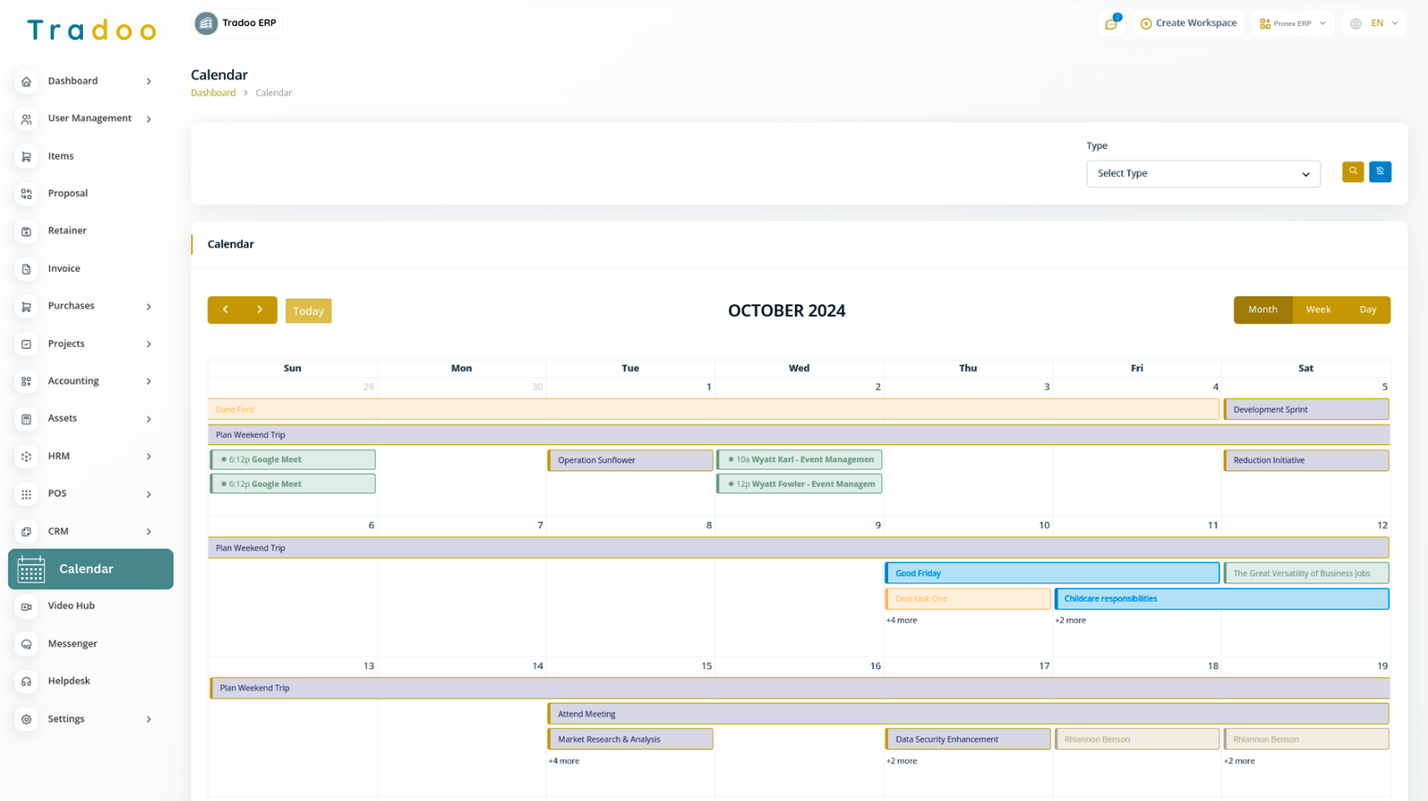 The calendar's event view simplifies tracking important meetings, ensuring you stay organized and never miss key appointments.