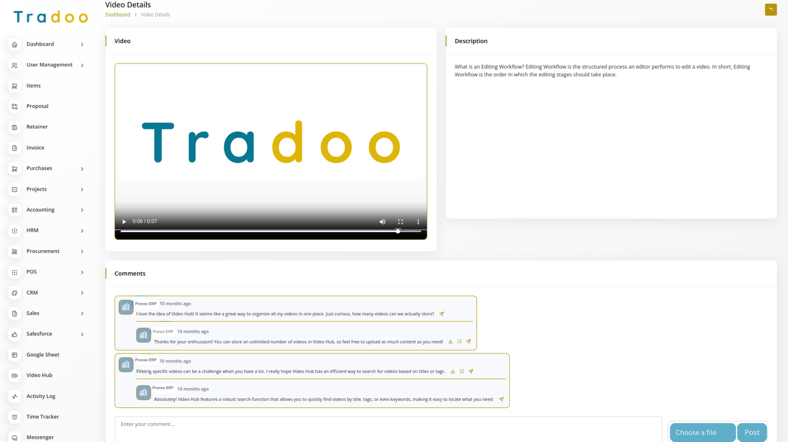 Easily access and interact with videos by clicking on the thumbnail or title. On the video page, you can watch the video, read its description, and engage with the comment box by adding your thoughts or attaching files. Enjoy seamless viewing for all video types.
